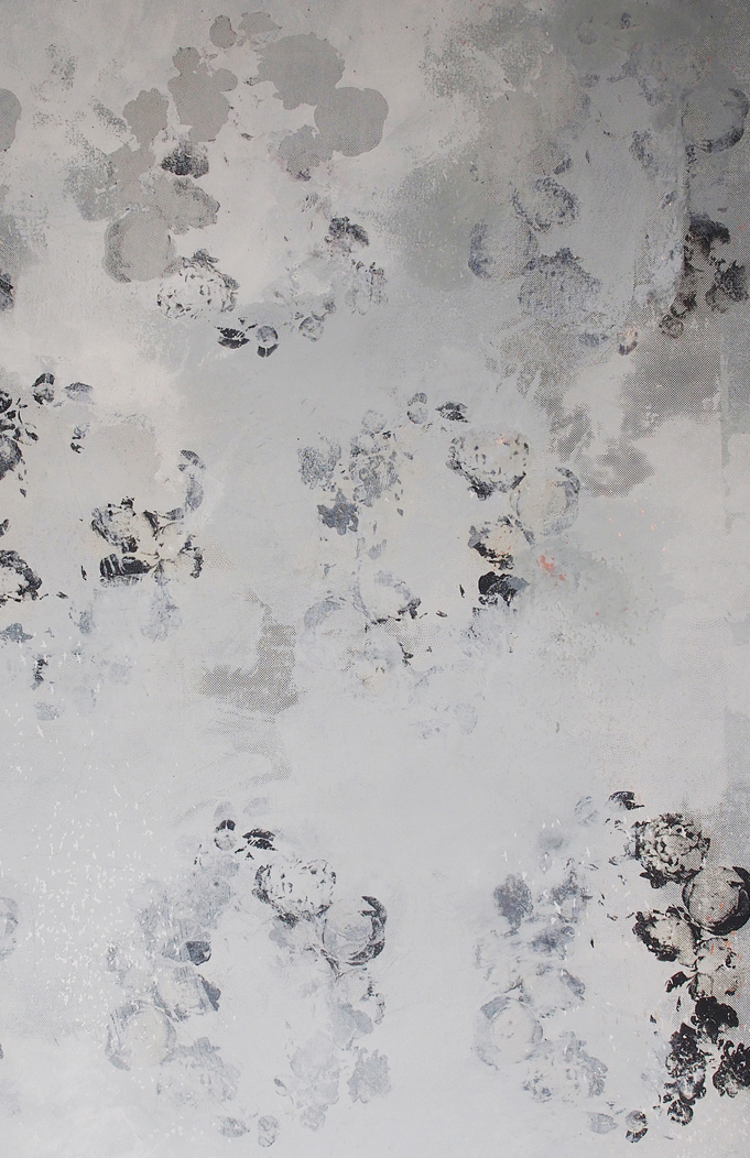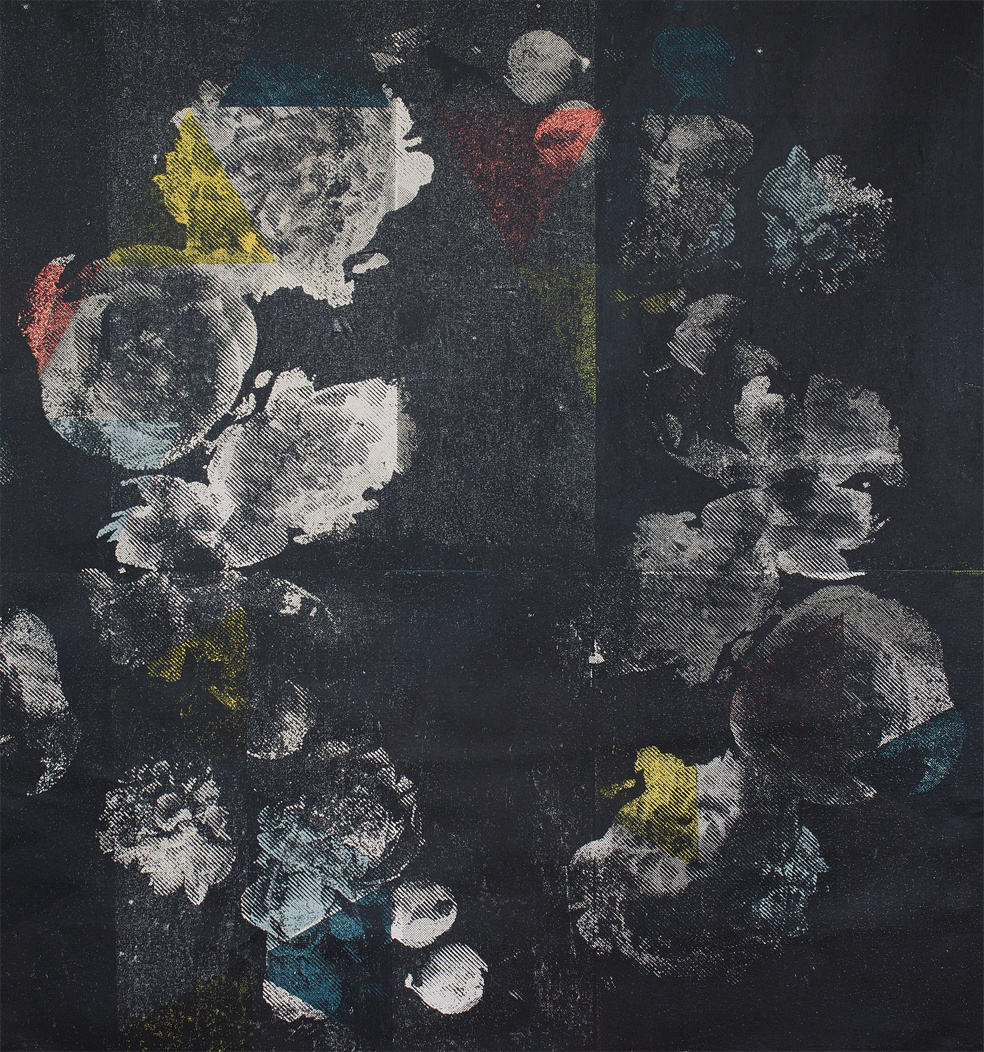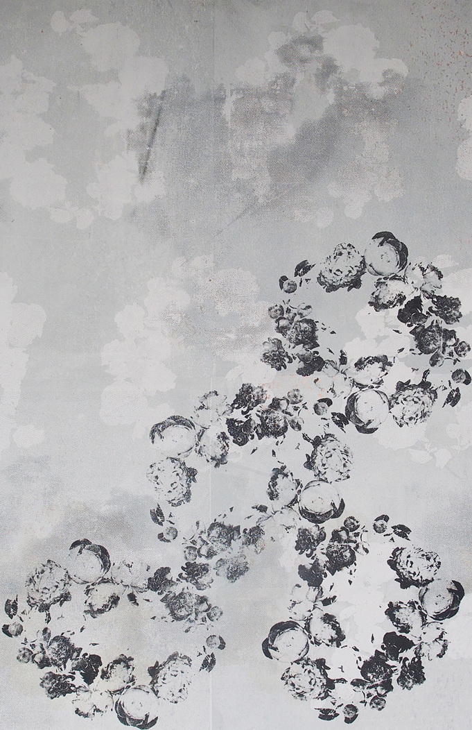 La délimitation de mes cadres de sérigraphie se lit clairement dans le motif par la superposition des impressions répétées et font référence aux papiers dominotés. J’utilise mes cadres de sérigraphie en recherchant l’expression de la mémoire altérée par les manques et les imperfections dans les raccords des motifs. Ainsi, je recherche volontairement ces irrégularités pour évoquer la fragilité des souvenirs qui s’estompent, autant que la sensibilité d’un geste artisanal en référence aux maîtres dominotiers. Par l’impression grand format, je travaille l’œuvre et le motif grandeur nature. Utiliser l’échelle humaine me permet de présenter mes œuvres comme des fragments de murs, porteurs d’histoire et d’identité. La surface mur est ici traitée comme un support d’expression, un marqueur d’identité, une dimension où on laisse son empreinte. C’est pourquoi j’utilise notamment des motifs issus de traditions folkloriques de tous horizons, pour la même portée identitaire qu’ils véhiculent. Je pose également la question à travers cette série « Mémoires » de cet héritage folklorique : est-il vivant, comment se traduit-il au présent ?