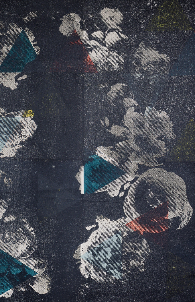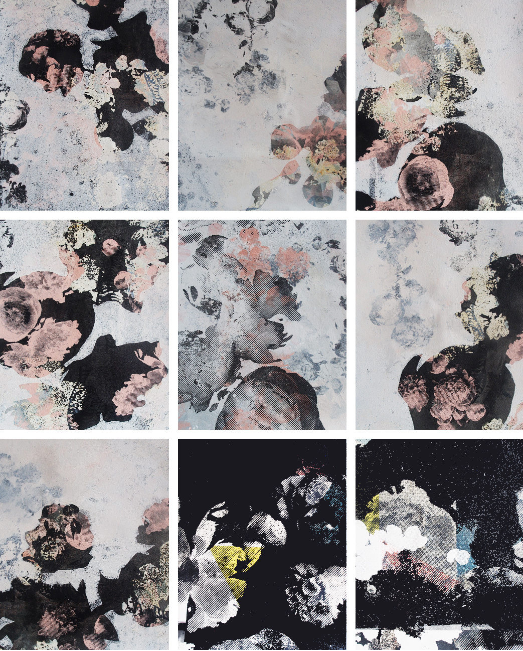 Pour la récente série intitulée « Mémoires », je puise dans l’histoire du revêtement mural à ses origines, quand le papier était dominos, des feuilles de papier imprimées à la planche de bois, au XVIe siècle en Europe. Les papiers dominotés étaient collés aux murs et juxtaposés les uns aux autres pour obtenir le raccord du motif, dans un but décoratif. La technique traditionnelle des maîtres dominotiers a disparu à l’ère industrielle, au profit de l’impression mécanisée que nous connaissons aujourd’hui.